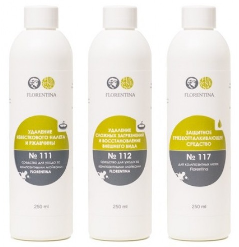 Набор Florentina включает сразу три средства, предназначенные для удаления всех видов загрязнений и эффективной защиты поверхности мойки из композитного материала.