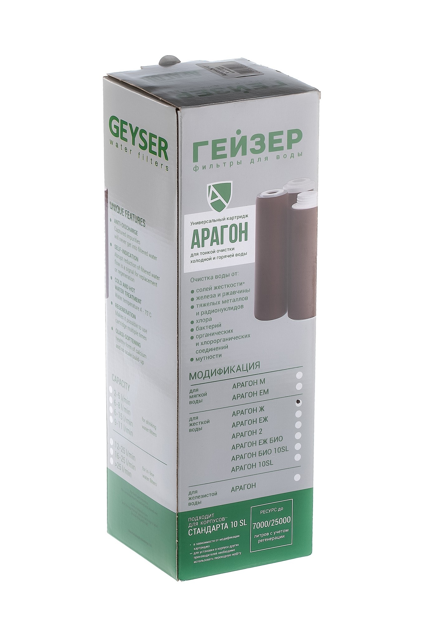 Арагон-Ж – картридж из материала Арагон, разработанный для очистки жесткой воды (средний уровень минерализации). Имеет 3 уровня фильтрации (механический, ионообменный и сорбционный).