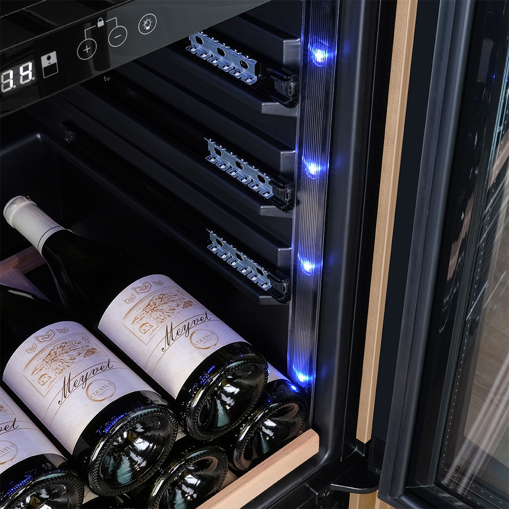 Компрессорный винный шкаф Meyvel MV77PRO-KBT2 (Натуральный бук) обладает большой вместимостью и способен разместить до 77 бутылок. Располагаются они на полках из массива бука. Внутреннее пространство шкафа разделено на 2 температурные зоны с возможностью настройки в диапазоне от + 5°C до +20°C. Холодильник поддерживает влажность в диапазоне 60-80%, как в настоящем винном погребе.